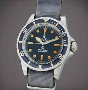 In 1972, Swiss movement Rolex copy watches spec’d its 5513 Submariner for Military use. These have gone on to carry the name “MilSub.” The key design characteristics of this watch are sword hands, an arrow tipped seconds hand, a circled “T” on the dial to signify the use of tritium, and a fully graduated bezel. Additionally, the lugs on this watch were fixed therefore meaning it could only be paired with a single-piece strap like a NATO. These MilSubs are highly coveted and were only in production for about four years.